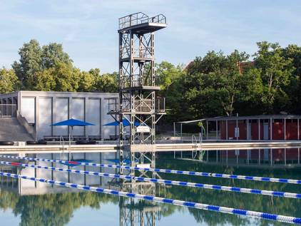 Die neu erstellten Betonbecken mit innenliegender Überlaufrinne versprühen noch immer einen rauen Charme und ermöglichen auf Grund ihrer Größe selbst an hochsommerlichen Tagen noch störungsfreies Schwimmen und Baden. Der Sprungturm aus genieteten Stahl ist für sich schon ein Denkmal, da er seit dem Jahr 1928 dem Bad sein Gesicht gibt. Von der 10 m- und 5 m-Plattform sowie von den zwei 3 m–Brettern springt man in das Schwimmerbecken, welches außerhalb der 4,50 m tiefen Sprunggrube durchgängig 1,85 m tief ist.