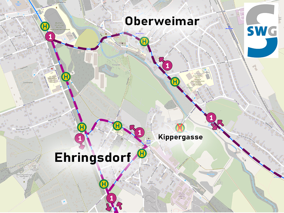 Ab Montag, den 13. Oktober 2025, mit Betriebsbeginn, bis voraussichtlich Freitag, den 17. Oktober 2025, verkehrt die Linie 1 aufgrund von Baumaßnahmen auf verschiedenen Fahrwegen. Fahrten Richtung Belvedere und Ehringsdorf führen ab der Haltestelle Falkenburg stadtein- und -auswärts über die Belvederer Allee und Ehringsdorf Am Anger. Auf diesem Streckenabschnitt entfallen die Haltestellen Ehringsdorf Kippergasse, Ilmschlößchen und Plan Oberweimar.