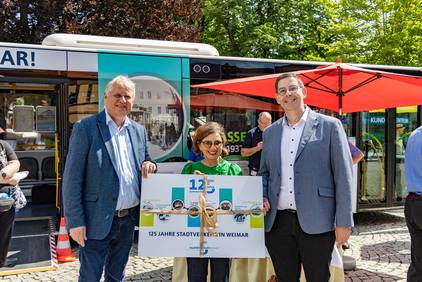 Nach einer feierlichen Eröffnung am 04.06.2024 auf dem Weimarer Goetheplatz schnitten die Beigeordnete für Bauen und Verkehr der Stadt Weimar, Claudia Dr. Kolb, zusammen mit den Geschäftsführern der Stadtwirtschaft Weimar, Bernd Wagner und Jörn Otto sowie dem Bereichleiter Nahverkehr, Kai Stodollik, einen Geburtstagstortenbus, an und verteilten diesen an die Fahrgäste. Anschließend wurde der mit der Chronik von 125 Jahren Stadtverkehr versehene Jubiläumsbus und eine mobile Ausstellung präsentiert. Die von dem Kurator Sylk Schneider konzipierte Zeitreise bietet spannende Einblicke in die Entwicklung des Stadtverkehrs von Straßenbahnen über O-Busse bis hin zu den heutigen emisissionsfreien Wasserstoffbussen. Der Jubiläumsbus machte im Anschluss daran noch auf dem Marktplatz Station.