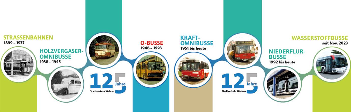 Am 04. Juni 2024 begeht die Stadt Weimar das 125-jährige Jubiläum des Stadtverkehr. War es anfangs die Straßenbahn, die durch Weimar zuckelte, so prägten 1945 die Obusse das Stadtbild. Heute fahren neue, dieselgetriebene Niederflurbusse, ebenfalls gibt es seit 2023 auch 3 Wasserstoffbusse mit neuester Technologie.