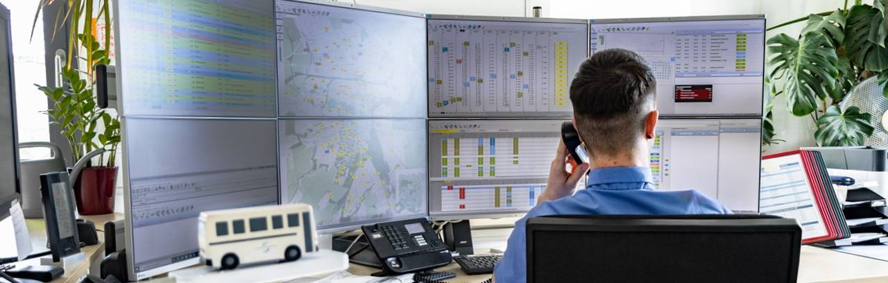 Mithilfe des rechnergestützten Betriebsleitsystem überwacht die Leitstelle unser Liniennetz, dadurch kann sie schnell auf Störungen oder Verzögerungen reagieren und alternative Routen oder Maßnahmen zur Aufrechterhaltung des Betriebs ergreifen. Die zentralen Kommunikationskanäle der Leitstelle sind die Funkverbindungen mit unseren Fahrerinnen und Fahrern sowie die Bereitstellung von Fahrgastinformationen in Form von Durchsagen und unseren digitalen Anzeigetafeln (DFI).